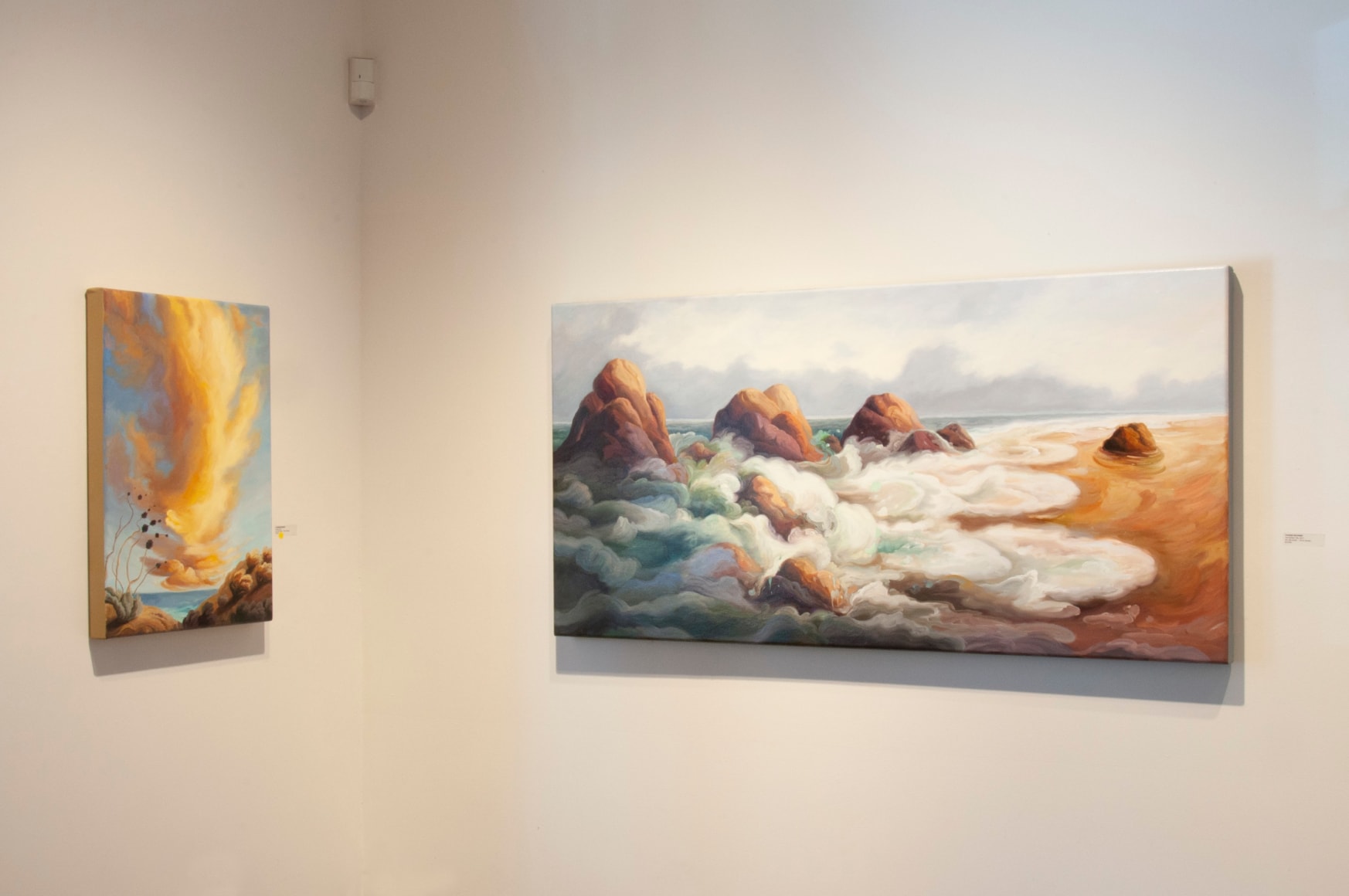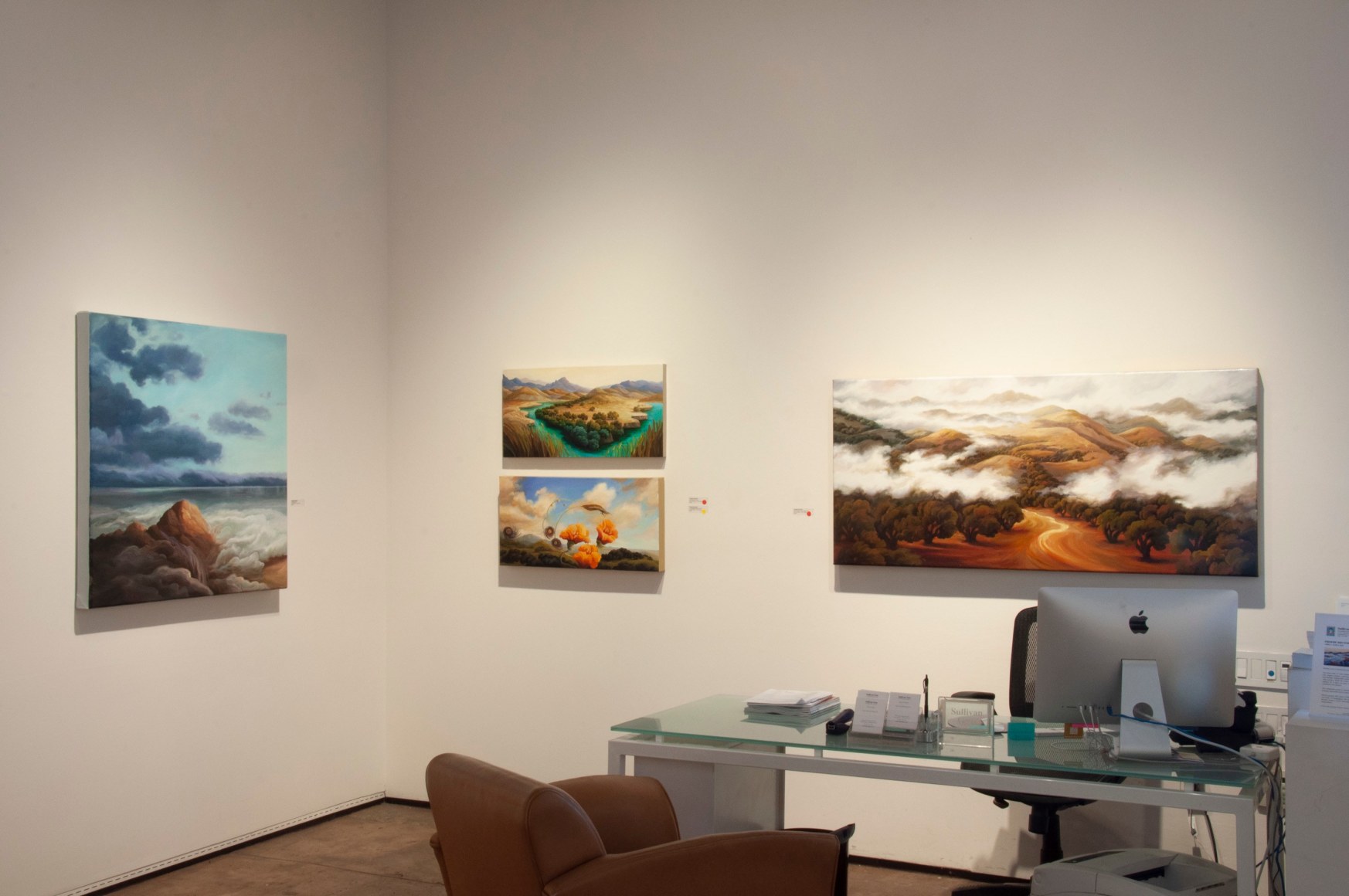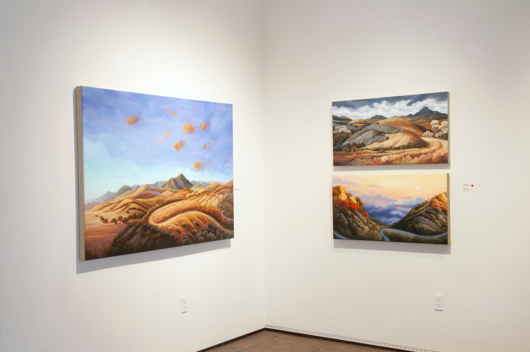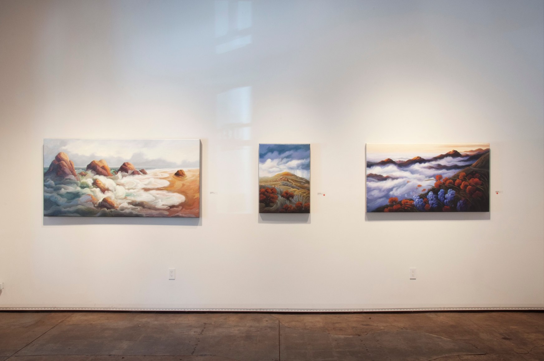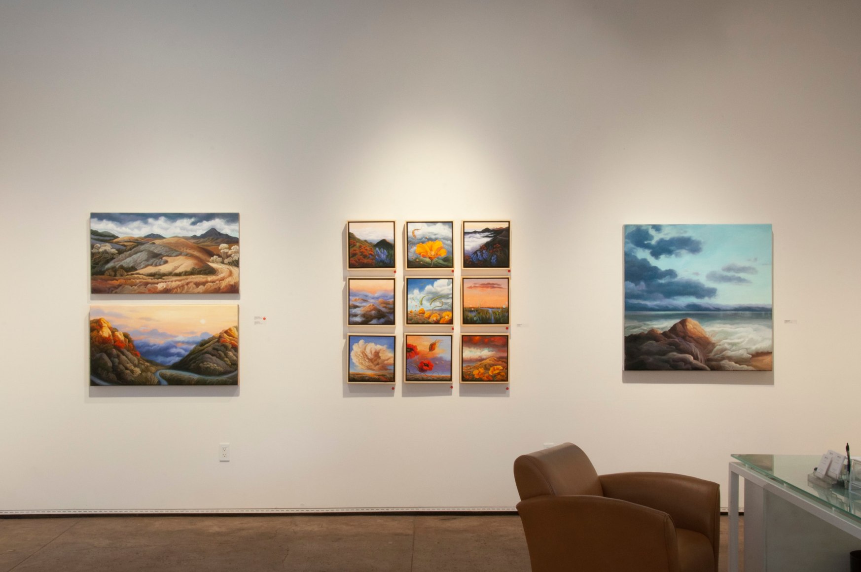 This latest body of work connects to the earth around us as it regenerates from a long lack of rain. Poppies explode, scattering their seeds to the wind for the next season of flowers. Roads lead through winding hills verdant with fresh grass. Clouds settle in to canyons to coat the hills with moisture. While her views are primarily imaginative, we are drawn to them by sense of memory for a place we have visited or more accurately, the familiarity of worlds we have wandered in our dreams.