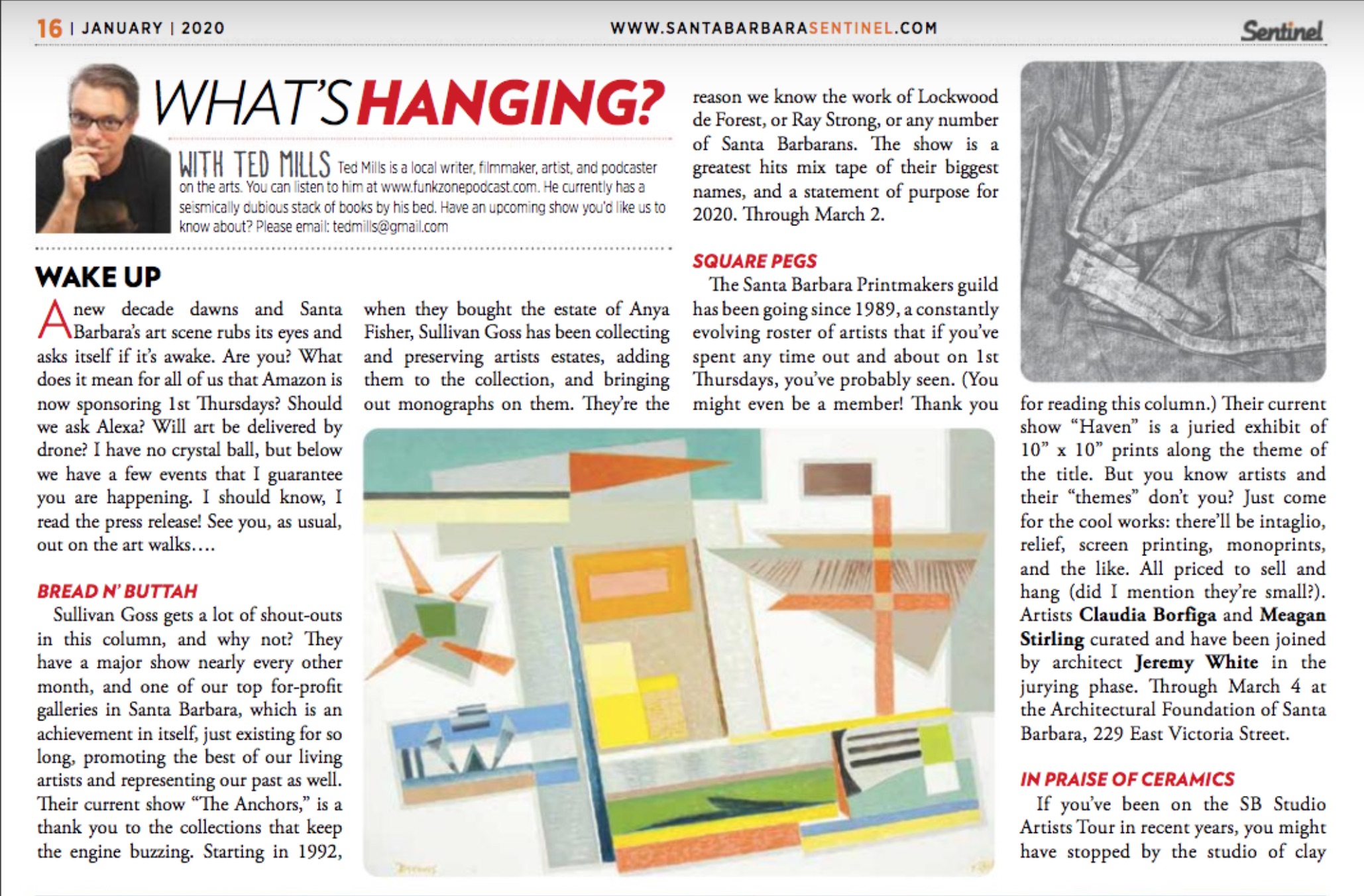 Sullivan Goss gets lots of shout-outs in this column, and why not? They have a major show nearly every other month, and one of our top for-profit galleries in Santa Barbara, which is an achievement in itself, just existing for so long, promoting the best of our living artists and representing our past as well.