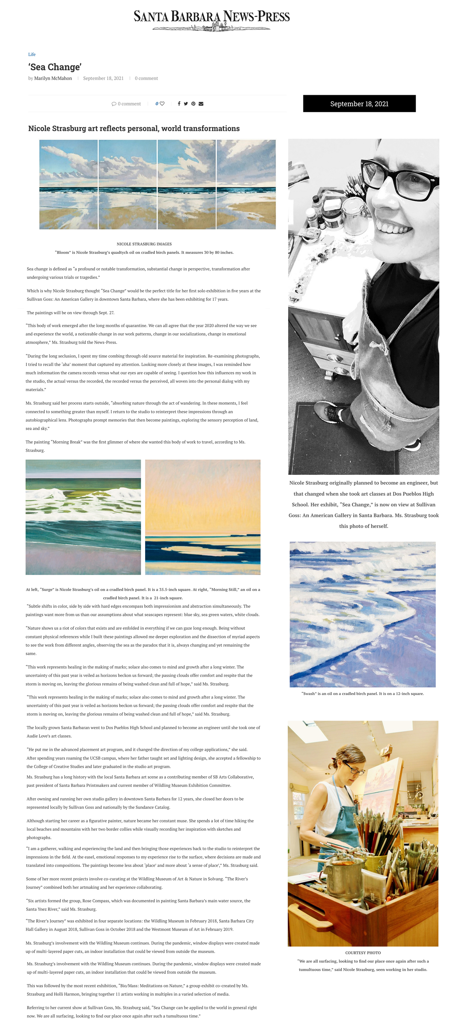 Referring to her current show at Sullivan Goss, Ms. Strasburg said, “Sea Change can be applied to the world in general right now. We are all surfacing, looking to find our place once again after such a tumultuous time.”