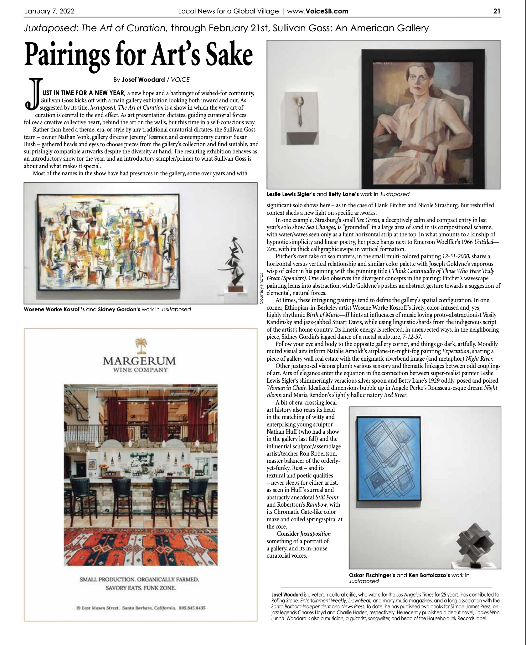 JUST IN TIME FOR A NEW YEAR, a new hope and a harbinger of wished-for continuity, Sullivan Goss kicks off with a main gallery exhibition looking both inward and out. As suggested by its title, Juxtaposed: The Art of Curation in which the very art of curation is central to its end effect. As art presentation dictates, guiding curatorial forces follow a creative collective heart, behind the art on the walls, but this time in a self-conscious way.