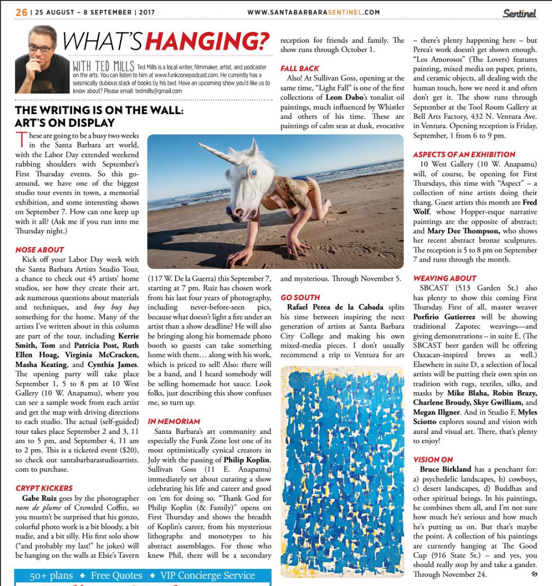 Santa Barbara’s art community and especially the Funk Zone lost of its most optimistically cynical creators in July with the passing of Philip Koplin. Sullivan Goss (11 E. Anapamu) immediately set about curating a show celebrating his life and career and good on ‘em for doing so.