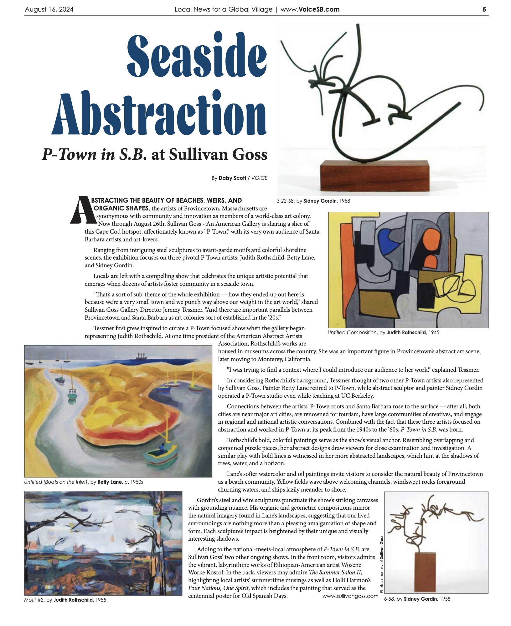 "I was trying to find a context where I could introduce our audience to her work," explained Tessmer In considering Rothschild's background, Tessmer thought of two other P- Town artists also represented by Sullivan Goss. Painter Betty Lane retired to P-Town. while abstract sculptor and painter Sidney Gordin operated a P- Town studio even while teaching at UC Berkeley.
